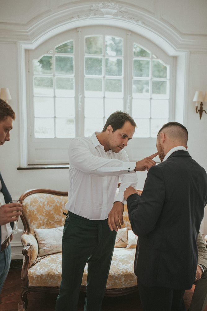 En parallèle, Ben se prépare avec ses témoins dans le salon du bas. Il enfile son costume avec son sourire (toujours là !) et une bonne dose d’excitation. L’ambiance est géniale, façon speakeasy décontracté : rires, complicité, ajustements de dernière minute… et quelques pauses pour réaliser que, oui, le grand moment approche. L’émotion commence doucement à monter, et j’aime vraiment voir ça!
