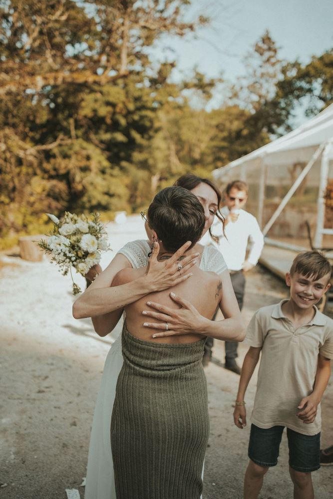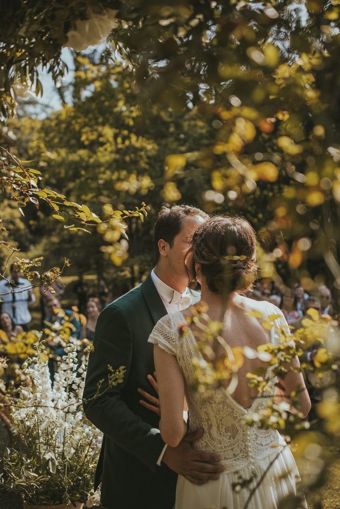 Pendant qu’ils échangent leurs alliances, je capte tout : la lumière dorée qui passe entre les branches, les petits sourires d’invités émus, les mains qui se serrent, les regards brillants. C’est un moment suspendu, simple et fort à la fois. Un de ceux qu’on n’oublie jamais.