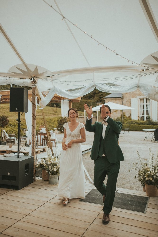 Alors que la nuit tombe lentement, le chapiteau illuminé dévoile une ambiance guinguette chic. À l’intérieur, la déco élégante et les lumières tamisées créent une atmosphère chaleureuse. L’entrée des mariés avant le dîner de mariage au Château du Denacre est folle. Encore un moment que j’adore. Voir vos invités si heureux d’être là, et vous, souriants comme jamais, émus. Puis vient le moment des discours. L’énergie monte progressivement, annonçant l’ouverture du bal. Sous une guirlande lumineuse, Julot et Ben s’élancent sur la piste, sous les regards bienveillants de leurs invités. Peu à peu, la piste se remplit et la fête bat son plein. La musique résonne, les premiers déhanchés sont là et la magie de cette soirée animés par Rémi de l’Agence L’Event se prolonge jusqu’au bout de la nuit. 01h du matin, je suis épuisé, mais j’ai en moi un sentiment particulier, celui d’avoir encore été le témoin d’une journée hors du temps, qui restera à jamais gravée pour moi et mes petits mariés…