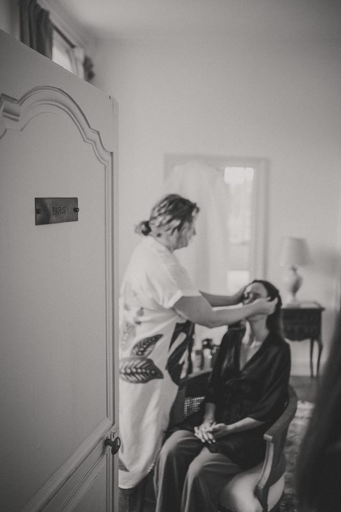 Dans l’une des superbes suites, Julot se fait coiffer et maquiller par la talentueuse Delphine HMUA. Un vrai petit cocon de calme au milieu d’une matinée déjà bien rythmée ! Pendant que je peaufine les compositions des accessoires, tout est ajusté au millimètre près pour que ça rende parfaitement.